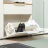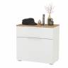 Тумба для обуви Октава 16.127. Цвет - белый шагрень/дуб золотой. Габариты (ШхГхВ) - 64,9х35,4х62,2 см. Аккуратная обувница с выдвижным ящиком для мелочей сверху и нишей с откидной дверкой с полками для обуви снизу. Вмещает до 6 пар невысокой обуви. Шариковые направляющие полного выдвижения. Металлические ручки.